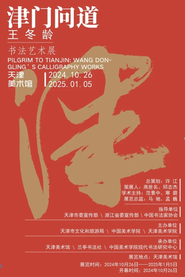 由天津市委宣传部、浙江省委宣传部、中国书法家协会为指导单位,天津市文化和旅游局、中国美术学院、天津美术学院主办,天津美术馆、兰亭书法社、中国美术学院现代书法研究中心承办的“津门问道——王冬龄书法艺术展”将于2024年10月26日下午在天津美术馆开幕。本次展览展出代表性作品100余件,体现了王冬龄60多年来,持之以恒的书法实践与创作。展览于天津美术馆三层3号、5号、6号展